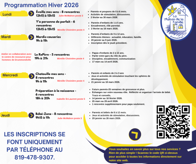 Notre équipe a travaillé avec cœur et passion pour vous préparer une saison riche en activités, découvertes et moments en famille 💛 📅 Les inscriptions débuteront le 1er décembre 2025 dès 8 h 30 et se feront uniquement par téléphone.🗓️ Les ateliers débuteront après les Fêtes, pour bien commencer la nouvelle année en beauté !